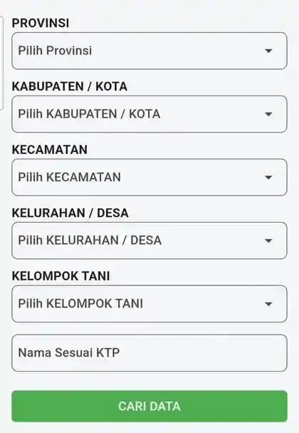 Pilih provinsi, kabupaten, kecamatan, desa dan kelompok tani di mana kartu tani terdaftar. Jangan lupa masukkan nama sesuai KTP.