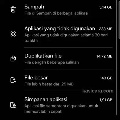 2. Tekan Sampah. Akan muncul aplikasi yang ada sampahnya. Buka satu persatu dan kosongkan semua sampah. Sampah merupakan file yang sudah kamu hapus dan masih tersimpan di memori penyimpanan hingga 30 hari sejak penghapusan.